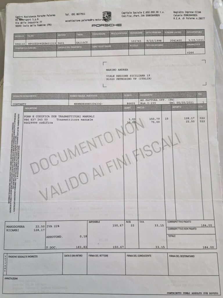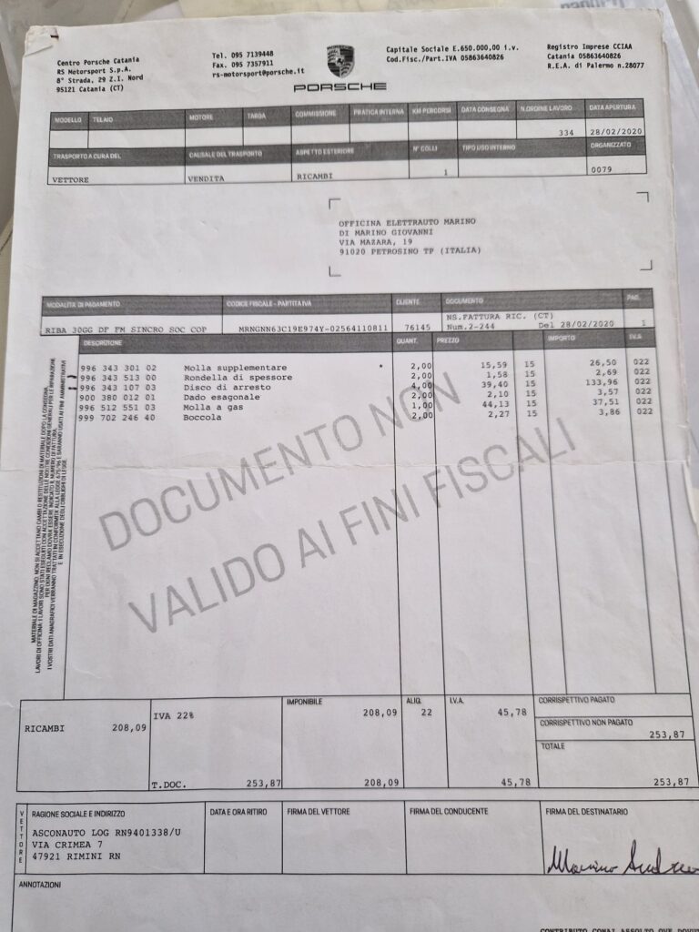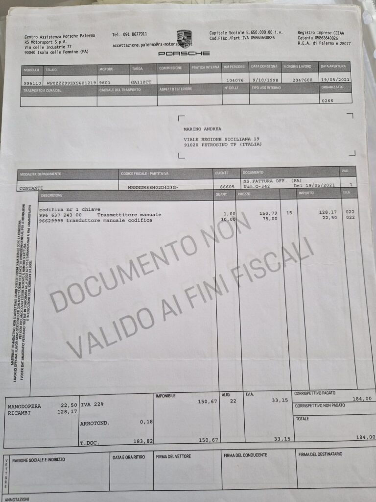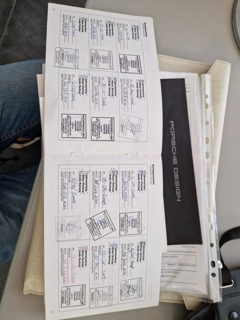 Libretto service timbrato da centro Porsche con cadenza annuale fino a dicembre 2018. Tagliando a gennaio 2020 con fattura ricambi Porsche. Ad ottobre 2020 montato il kit albero e cuscinetto intermedio rinforzato doppia fila M96. A maggio 2021 a 104.076 km ingresso officina Porsche per codifica chiave.